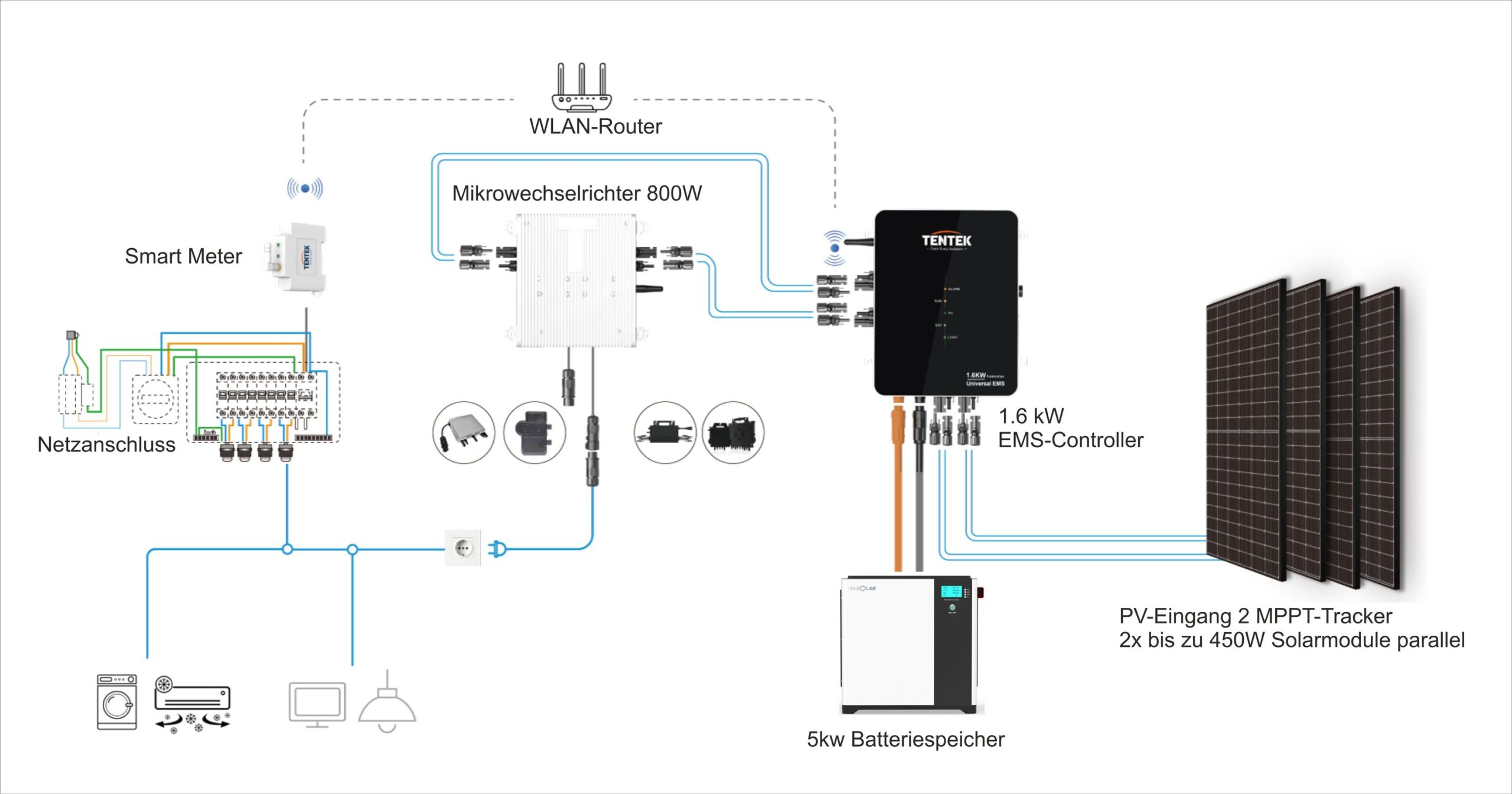 Das Tentek EMS 1,6 kW ist die zentrale Steuereinheit des Systems, die zusammen mit der Photovoltaikanlage (PV-Module) und dem Mikrowechselrichter von Tentek für die effiziente Umwandlung und Steuerung der Solarenergie verantwortlich ist. Die Photovoltaikanlage erzeugt saubere, erneuerbare Energie, die von den PV-Modulen in Gleichstrom umgewandelt wird. Der Mikrowechselrichter von Tentek sorgt dafür, dass dieser Gleichstrom in Wechselstrom umgewandelt wird, der für den Eigenverbrauch im Haushalt oder für die Einspeisung ins Netz genutzt werden kann.